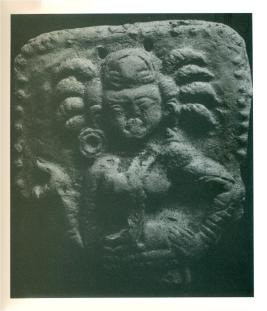 | Description / विवरण | The lady with her coiffure framing her face and a turban on her head. She is ornamented with circular earrings and bangles and folds of her upper garments are visible on her torso. It is interesting to observe that there are stalks of grain attached to her hairdo, thereby indicating her relatiion to cults associated with prosperity and vegitation. This female figurine probably prefigures the idea of the Sakamabhari, the goddess of plenty. |