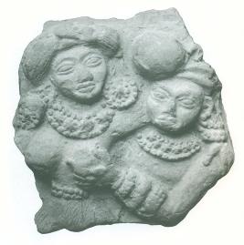 | Description / विवरण | The female figure standing to the right of the male figure. Her left hand is around the shoulder of her companion. His right hand spreads round her shoulder and left hand fondles her breast. The female figure wears a turban like headgear, eardisc, torque, waistband and bracelets. The man wears a lopsided turban, torque and bracelets. |