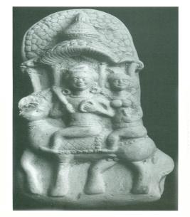| Description / विवरण | A toy cart featuring a divine couple riding on an animal, probably a tiger. The figures are arranged below a two-tired temple like structure supported by what appears to be wooden posts. The backslab is covered with dense foliage. The man holds a sword and shield. He wears a turban, earrings, waist sash and anklets. The female figure is seated behind holding an object in her left hand. The genitals of the animalare clearly depicted. It has a rather bovine tail. |