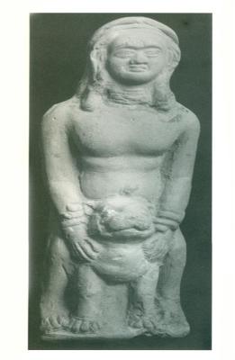 | Description / विवरण | A male figure depicted riding an animal, which is either a dog or a tiger. The terracotta figuring conceived in the round has been rendered realistically. The man has long hair and wears a cap-like headgear. The lower garment has been indicated behind the figure, while prominence has been given in portraying his navel. It is difficult to identify the figure. |