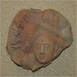 | Description / विवरण | Fragment of a plaque depicts a lady with auspicious hairpins attached on her coiffure styled as weapens.She is having prominent eyes,sharp nose, and parted lip.The figure is adorned with circular earrings.headband and girdle. |