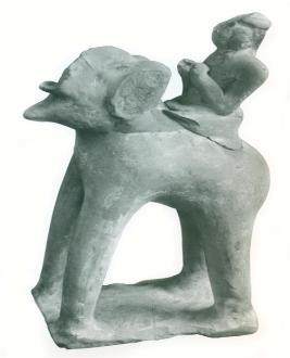 | Description / विवरण | An appliqued male figure is shown seated on the back of an elephant. Both the elephant and its rider are partially defaced. |