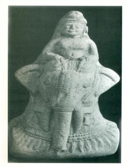 | Description / विवरण | This is a wheeled elephant and its rider. The elephant is depicted with two tusks and the rider carries two goads or ankusas. The elephant is richly bejewelled with neck and head ornaments. Both these ornaments have bells attached to them. |