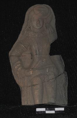 | Description / विवरण | The broken figure depicts a male Yaksha in standing posture with round eyes, sharp nose and parted lips. The figure wears adgear, elongated earrings, girdle, bangles, armlet and ornamented waist band. His right hand rests on the waist and holding an unidentified object, may be a fish by left hand. |