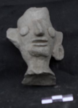 | Description / विवरण | This is a representation of a male head with round appliqu eyes, long sharp nose and parted lips. The figure wears circular earrings on ears. |