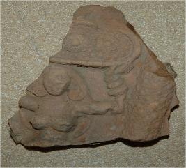 | Description / विवरण | Fragment of a plaque depicts a female in standing posture with totally eroded face and wearing circular earrings,bangles and necklace.The lady is carrying an unidentified object in head. |