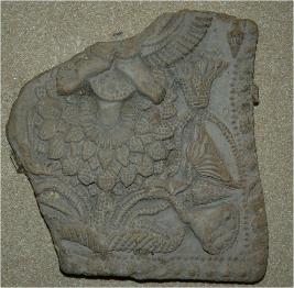 | Description / विवरण | Fragment of a plaque depicts a feet is placed on a full bloomed lotus and wears anklets. |