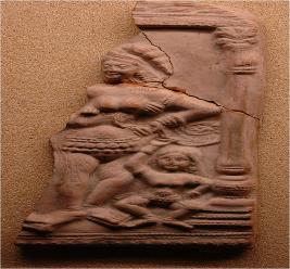 | Description / विवरण | Fragment of a plaque depicts mother and child in standing posture.The mother is having prominent eyes, sharp nose and curved lip and adorned with elongated earrings,armlet, bangles, waistband and headdress.The little child in dancing posture with prominent face and wears necklace and earrings. |