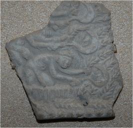 | Description / विवरण | Fragment of a plaque depicts three male figures are cutting the crops with sickle. |
