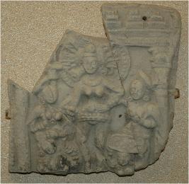 | Description / विवरण | Fragment of a plaque depicts a lady with auspicious hairpins attached on her both side coiffure styled as weapons.she is having sharp eyes, blunt nose and parted lip.The figures is adorned with girdle, waistband,bangles, and anklets.Two others figures are also visible both side of her. |