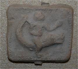 | Description / विवरण | Fragment of a plaque depicts a man on the back of crocodile with eroded face. |