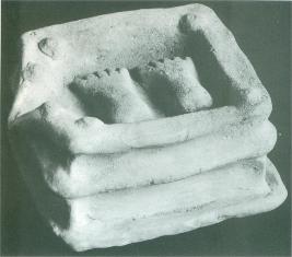 | Description / विवरण | This is a terracotta votive pedestal depicting footprints, resting on a raised platform with fluted outlet to let out the water. On four corners of the pedestal and on the edges of the water outlet are floral decorations, which are now mostly eroded. |