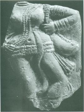 | Description / विवरण | The terracotta plaque depicting a female figure carrying a harp. She is adorned with a triple-stringed girdle, heavy bangles and a triple-stringed ornament running down her torso. Her diaphanous garments has been portrayed with masterly craftsmanship. A terracotta plaque depicting a man with a harp and a dancing female figure has also been reported to have been found from an unspecified site of eastern India Poster, 1986,p.150 . |