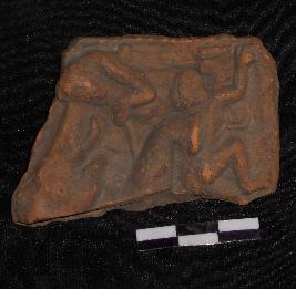 | Description / विवरण | Fragment of a plaque depicts war scene featuring an elephant holding a man by its trunk and killing the other person by right leg. |