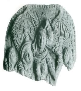 | Description / विवरण | A plaque showing two female figures with two attendants holding two fans in the background. The female figure to the right is leaning on the shoulder of the other and her left arm is round her shoulder. The figure to the left is fidding with her ear ornament with her left hand. The figure on the right wears a flowing headscarf and fringes of hair are visible under it. She also wears ear ornaments, thick torque and necklace. The other has her hair tied to a knot on left side, wears a necklace and a beaded string across her chest, bracelets and armlet. The lower part of the plaque is broken. It has a border of circlets and a perforation on top. |