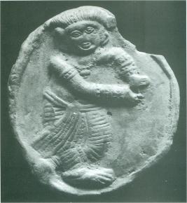 | Description / विवरण | This small circular plaque portrays a man clad in a pleated dhoti or lower garment and turban. The figure is adorned with armlets, a necklace with a large pendant and heavy bangles. The posture of the dancing figure in rather awkward and plaque with similar stance has been stratigraphically located in layers pertaining to 1st and 3rd centuries A.D. at Chandraketugarh. |
