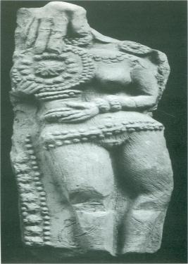 | Description / विवरण | A fragment of a plaque portraying a bejewelled female figure holding a decorated mirror, which she offers to the main figure beside her. The principal figure is lost, except for the right palm, which is placed over the mirror being offered to her. That the principal figure is a divinity is evident from a terracotta mould of a female divinity with the ten auspicious hairpins accompanied by an attendant with a bird-shaped headdress and carrying a mirror in her hand Bautze, 1995, Pl.IIIa . This plaque in high relief delineates in minute details lines on the fingers of the principal figure, the diaphanous clothes, the jewellery and the decorative border decoration of the plaque. |