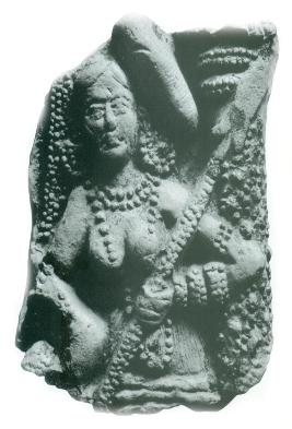 | Description / विवरण | A broken plaque featuring an attendant figure holding a spear in her left hand while her right had rests onher waist. Her hair is tied to her left in a knot. She wears eardiscs, necklace, armlet, bracelets and stringed girdle. |