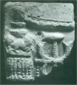 | Description / विवरण | A fragment of a plaque depicting a pillar with double animal capitals and a symbol with a fish motif. It is possible that this fragment formed a part of a larger plaque depicting an enshrined divinity. Representation of the deity with ten hairpins, have been frequently found represented in a pillared hall. |