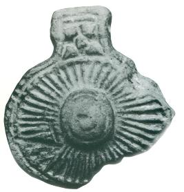 | Description / विवरण | This is a remarkable piece of terracotta from Harinarayanpur. Moulded on both the sides, the object represented is a pendant. The motif delineated on either side is a wheel with multiple spokes. On the top of the pendant is the perforation meant for hanging the piece. |
