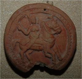| Description / विवरण | The circular plaque depicts a female horse rider.Face of the rider is eroded. |