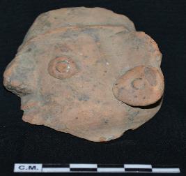 | Description / विवरण | A broken terracotta mle head with round applique eyes, blunt nose and parted lip. The figure wears headress and circular earrings. |