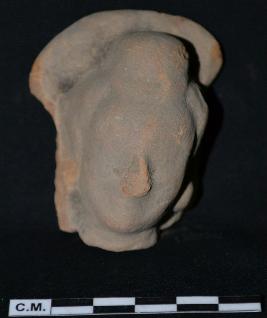 | Description / विवरण | A broken plaque depicts a male head with eroded face. The figure is having circular knot, curly hair and circular earrings. |