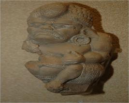 | Description / विवरण | This is representation of a male figure in seated posture with prominent eyes, blunt nose and parted lip.The figure is adorned with earrings, headdress and waistband.His left hand on the rests on the left knee. |