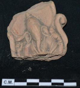 | Description / विवरण | The framents of plaque depicts the image of Lord Ganesha with all his attributes in two hands. He is highly ornamented. A halo is placed over his head. |