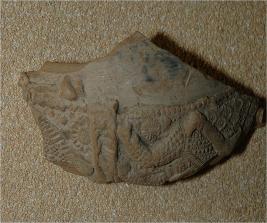 | Description / विवरण | Body portion of a buff coloured pot depicts floral, vegetal and beaded designs in the outer surface.It is having medium texture and medium fabric. |