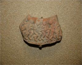 | Description / विवरण | Body portion of a red coloured pot depicts serice of peoples in moving posture and standing in a row.It is having medium texture and medium fabric. |