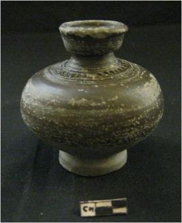 | Description / विवरण | A miniature pot with decoration , probably used for religious purpose . |