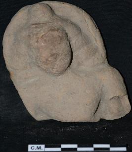 | Description / विवरण | The broken terracotta plaque depicts a male head with eroded face. He is having circular knot and curly hair. |