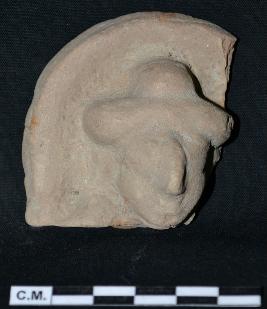 | Description / विवरण | A broken plaque depicts a male in standing posturewith round eyes, blunt nose, curved lips. The figure is having headdress and circular earrings. |