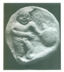 | Description / विवरण | A small circular plaque depicting a man holding a tortoise. It is possible that this is a depiction of Kachapa Jataka. |