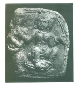 | Description / विवरण | The plaque depicts a female to the left of the male figure. Which is partly broken. He is standing with the hands folded to his chest anjali posture . His turban is abraded, the lower garment is upto his knee and he wears a thick sash round the waist. The female figure is seated on a stool. Her right hand is on the chin of the man and the left hand is raised up from the elbow but the palm is faces down. She wears the lower garment to her ankle and ornaments like eardisc, torque, bracelet,girdle and anklets are also visible. |