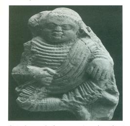 | Description / विवरण | This is a seated male figure attired in a samghati, the symmetrical folds of which cover both the shoulders of the figure. The nature of the clothing is indicated by the fact that it is not diaphanous as is common with most garments portrayed on figures at the site.The similar seated and identically attired figure depicted on an unbroken plaque at the Metropolitan Museum of Art New York that hails from Chandraketugarh. The figure is portrayed seated on the floor and holding the chains of a barking dog. Seated on a throne above is a princely figure, richly ornamented and wearing an asymmetrical turban. His wife stands before him and she too is sporting an asymmetrical coiffure with plumes attached to it. Both the figures are richly adorned and wear pleated garments. The lady seems to be in a gesture pacifying the man, who is depicted arguing with his index finger raised. Apart from the dog, also depicts two ducks and a monkey. The present fragment probably depicts same theme. |
