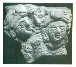 | Description / विवरण | Fragment of a plaque depicting two men. One of the figures has been rendered in profile, while the other has been portrayed in frontal pose. Both the men are sporting turbans with central diadem. |