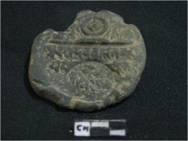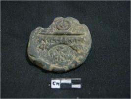 | Description / विवरण | This terracotta sealing depicts two deer and a wheel between the deers. One line inscription is depicted on the seal. |
