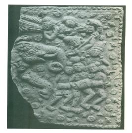 | Description / विवरण | This plaque in high relief depicts a harvesting festival in progress. Portrayed on the plaque is a procession led by musicians. An ornamented elephant follows the musicians Among the musicians, there are men playing on the drum and a long flute. In the background two men are seen carrying the harvested crop. |