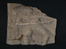 | Description / विवरण | A plaque depicting a male figure. He is standing and ornamneted with bangles, earings, necklaces, girdle etc and holding an unidentified object. |