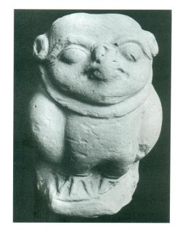 | Description / विवरण | This is yet another illustration of a rattle conceived in the round and produced with the help of two moulds. It is the depiction of an owl with well defined claws. Compared to the other owl figures it is very sparsely decorated. |