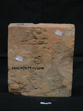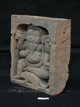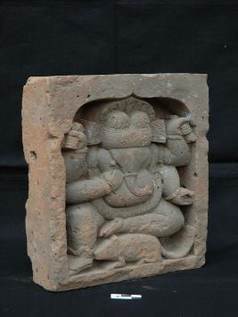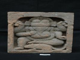 | Description / विवरण | The plaque depicts image of lord Ganesha with four hands.He is holding lotus in upper right hand and Ghanta in upper left hand, conshell sankha in lower left hand and lower right hand is rested on his chest.His left leg is folded over his attendant Mushaka . |