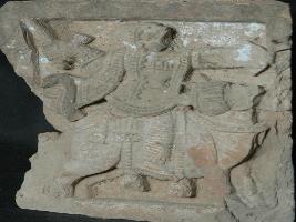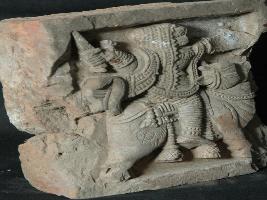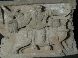 | Description / विवरण | Fragment of a plaque depicts, figure of a warrior is riding on a horse and holding sword in his raised right hand. |