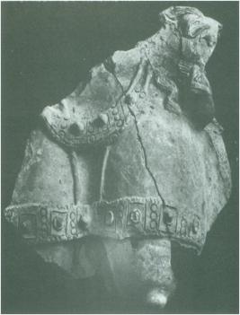 | Description / विवरण | This terracotta depicts a massive torso in dull red colour. However only the front portion of this exquisitely carved piece exists at the moment. The torso is adorned with carved and appliqued jewellery. The extant figure must have been visualized as a huge terracotta sculpture in the round resembling stone sculptures and probably decorated a temple as a figure flanking the doorway or as one of the subsidiary deities. |