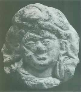 | Description / विवरण | This is a rather eroded fragment of a plaque depicting a human face with a cloth framing the forehead and then encircling the top-knot on the head. Strings of beads are evident hanging from this band framing the face. The figure is also decorated with a thick floral necklace and heavy circular earrings. The head tilted to one side with a distinct direction in the gaze of its eyes imparts s definite portrait-like quality to the plaque. |
