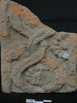 | Description / विवरण | An eroded temple plaque depicts floral motif. |