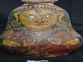 | Description / विवरण | A painted Manasa ghat depicts face of a folk deity. Red, yellow, black, green sheds are used. |