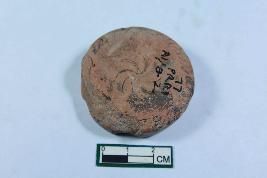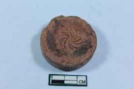 | Description / विवरण | Disc with strokes along the edges and flower motif in the centre on both sides having rough surface. |