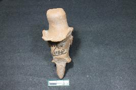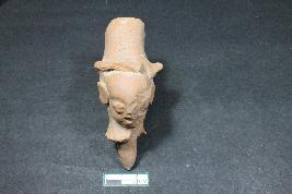 | Description / विवरण | Head of a Human figurine with prominent head gear, traces of facial features, ears marked by circlets and projected bottom having rough surface. |